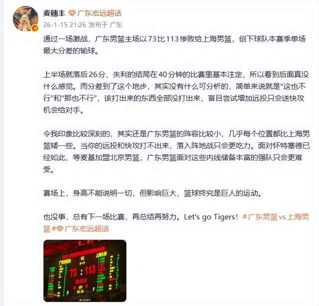 - 2026年1月19日广东和四川的常规赛,这场比赛广东打得还是太松懈了,特别是第二节一度连续出现失误。幸好优势在,...发表于: 01-19 23:33
