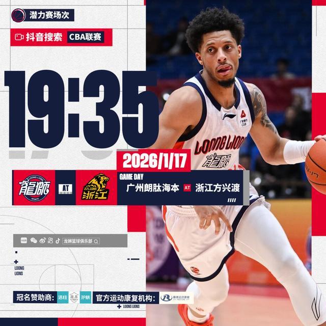 龙狮篮球俱乐部2026-01-16 16:53:342025-2026赛季CBA联赛常规赛 第十六轮 - 客场挑战广厦⏰2026年1月17日 明晚 19:35广州朗肽海本(客) — 浙江方兴渡(主)直播:抖音搜索 CBA联赛