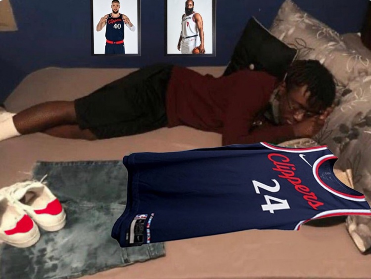 快船官推脑洞图:球迷和鲍威尔球衣睡觉背景是哈登&祖巴茨定妆照
