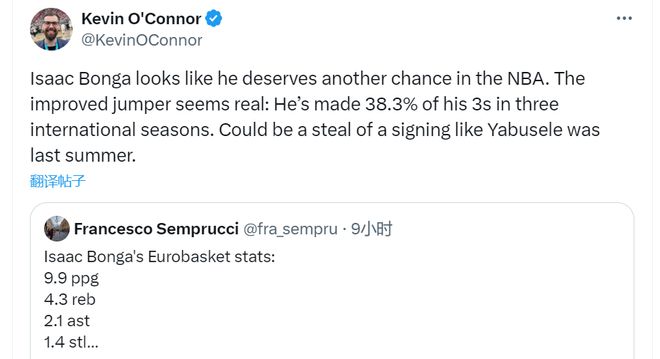 NBA名记凯文·奥康纳点评了邦加的表现:“艾萨克·邦加看起来值得在NBA再争取一次机会。他的跳投能力提升确实有目共睹:过去3个国际大赛季他的三分命中率高达38.3%。这笔签约或许能像去年夏天的亚布塞莱一样,成为一笔划算的签约。”