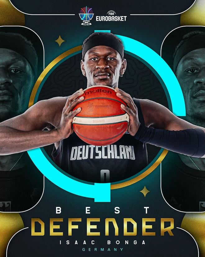 2米03的邦加不仅获得决赛MVP,他还被评选为本届欧锦赛最佳防守球员。欧锦赛上,邦加担任德国男篮首发小前锋,他场均得到9.9分4.3篮板2.1助攻1.4抢断0.7盖帽,投篮命中率53.3%,三分命中率45.2%,罚球命中率68.8%。邦加打出了非常高的进攻效率,成为施罗德身边的好帮手。