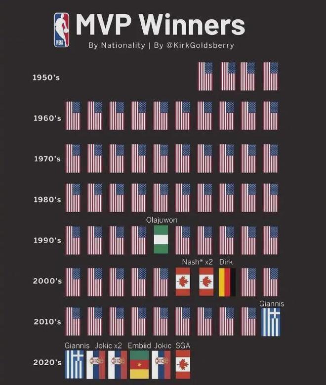 一个现实情况是:NBA连续7届常规赛MVP均由国际球员包揽。