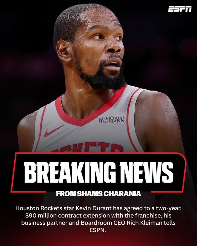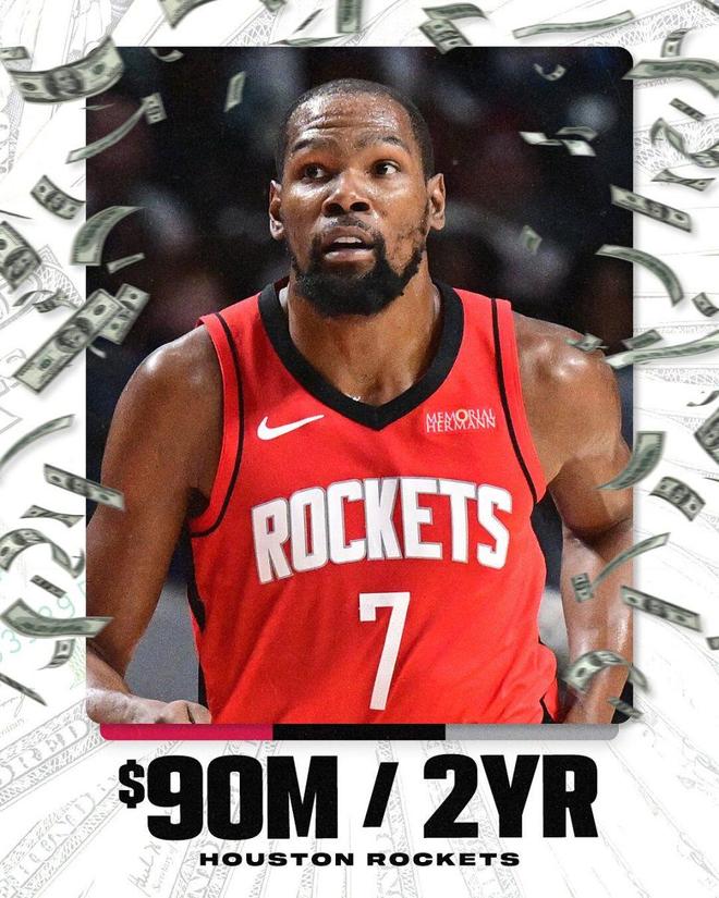 杜兰特本有资格获得一份为期两年、价值1.2亿美元的顶薪续约合同,但他在选择火箭队作为交易目的地时就明白,他将在新合同中牺牲一部分薪水——在这种情况下大约是3000万美元——这样双方可以长期合作,并为球队在阵容建设上提供灵活性。