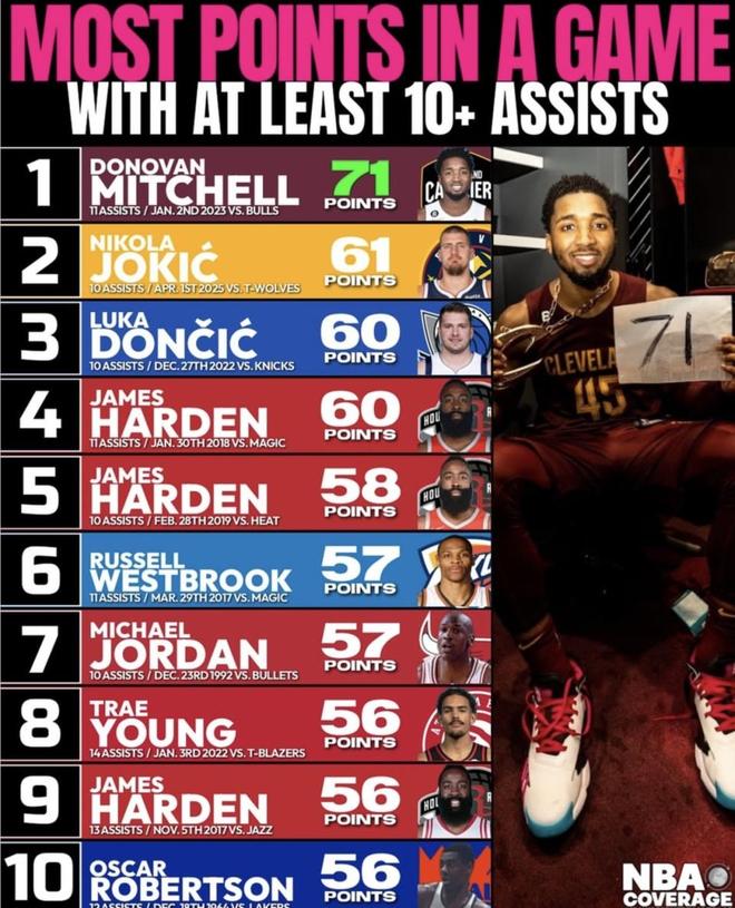 最近,知名篮球媒体“NBA Coverage”放出一份“10+助攻还能爆砍高分”的榜单:米切尔 71+11 领跑,哈登多次上榜,约基奇、东契奇紧追不舍。谁才是你心中最能兼顾得分与串联的那位?