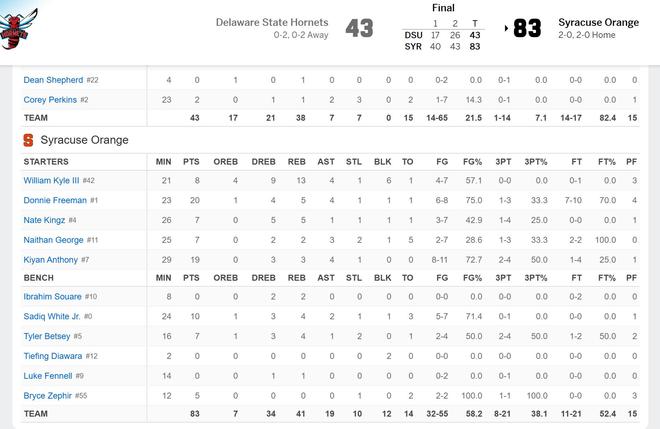 北京时间今日,在NCAA常规赛中,雪城大学以83-43击败了特拉华州立大学。本场比赛,前NBA球星卡梅隆-安东尼的儿子基扬-安东尼首次出任NCAA联赛的首发,他全场出场29分钟,11投8中高效