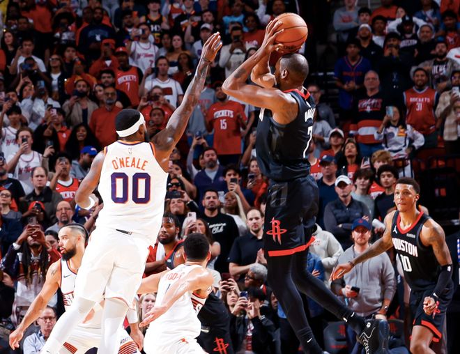 火箭本赛季攻防两端都有着出色表现,防守端场均只丢111分,是联盟失分第三少的。而在进攻端,火箭并不依赖三分球,只是在得到空位才会出手,场均30.6三分出手是联盟第二少。杜兰特的加入为球队带来火力支持,场均拿到25.7分5.1篮板;阿门则拿到18分7.4篮板,谢泼德也有13.2分。