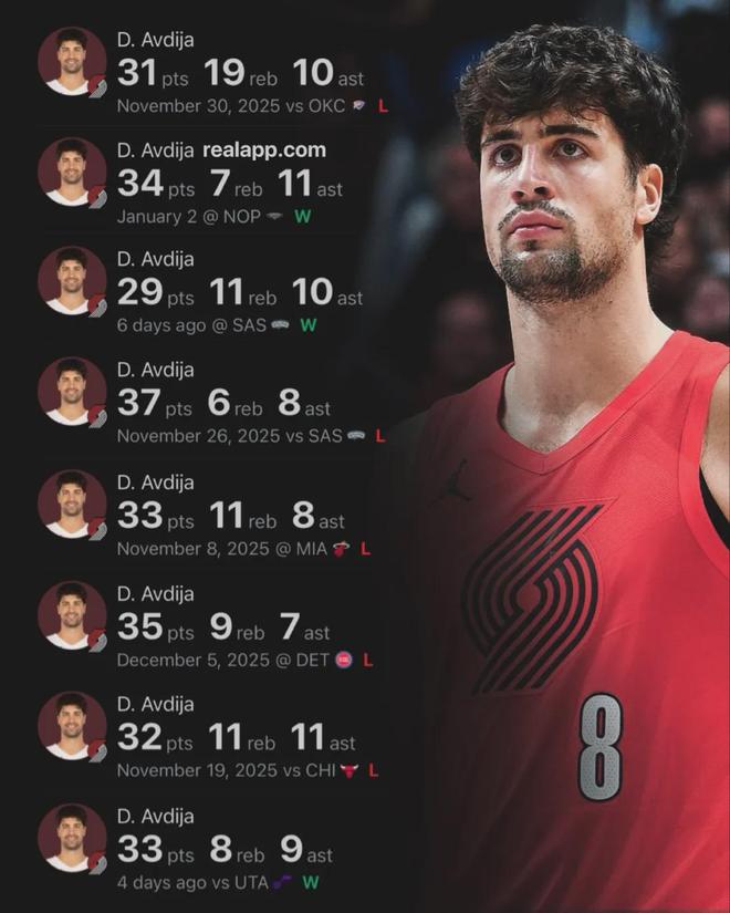 阿夫迪亚创造了一项队史纪录:仅用39场比赛拿到1000分250板250助,成为开拓者队史最快达成的球员。本赛季至今,阿夫迪亚场均26.1分7.1篮板7助攻0.8抢断0.6盖帽3.9失误,三项命中率:46.7%,35.8%,80.1%。