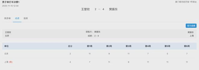 11月15日,第十五届全国运动会乒乓球男子单打半决赛在澳门银河综艺馆进行。王楚钦、樊振东两位奥运冠军正面交锋。前3局樊振东两度落后两度扳平,第6局,樊振东0比4开局,之后连得6