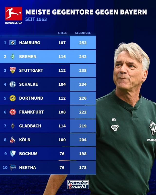 直播吧9月26日宣 本周五晚拜仁即将在主场迎战不莱梅,德国转会市场网统计了德甲成立以来面对拜仁丢球数最多的10支球队,其中汉堡排名第一,不莱梅就位居第二。