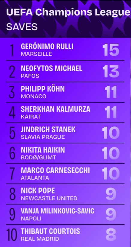 雷速体育10月2日宣 本赛季欧冠联赛阶段已战罢2轮,相关数据机构统计了本赛季欧冠截止目前的门将扑救次数榜。马赛门将鲁利以15次扑救独自领跑,纽卡门将波普和那不勒斯门将萨维