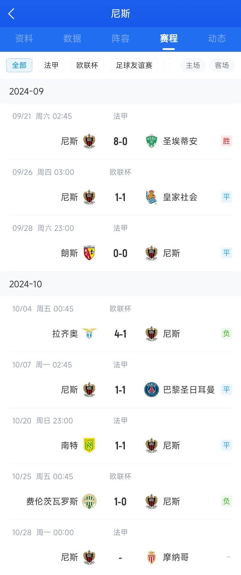 自上个月9月21日尼斯8-0大胜圣埃蒂安之后,球队在长达一个多月的时间里一场没赢,总计6场4平2负。
