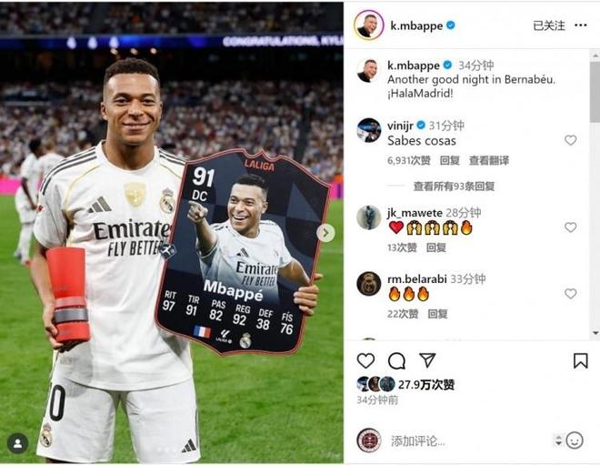 而姆巴佩则通过社媒分享了喜悦,他晒出赛前领取西甲 9 月最佳球员奖杯的照片,配文 “又一个美妙的伯纳乌之夜,Hala Madrid!”,字里行间满是对球队与主场的热爱,也让球迷感受到他当下的良好状态。