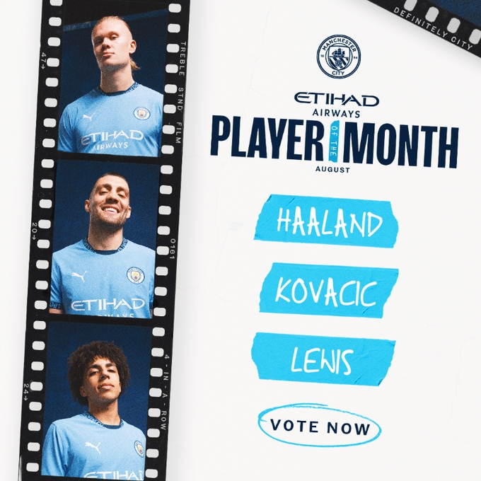 9月3日报道 曼城官方公布8月最佳球员候选名单,三位球员分别是哈兰德、科瓦西奇和里科-刘易斯。