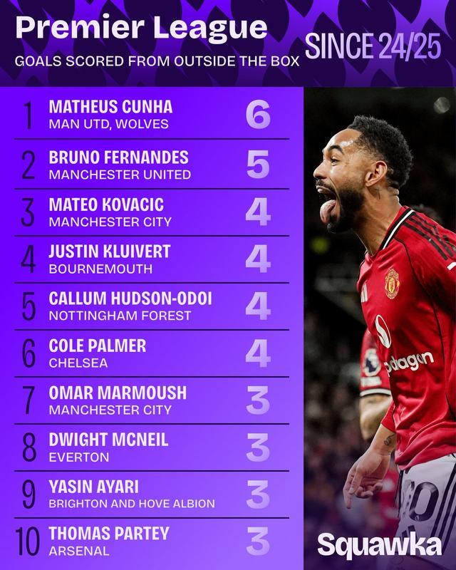 北京时间10月26日,知名数据平台Squawka列出了自上赛季以来,在英超联赛中禁区外进球最多的球员。库尼亚6球领跑榜单,B费5球位居第二,科瓦契奇4球第三。2024/25赛季以来禁区外进球