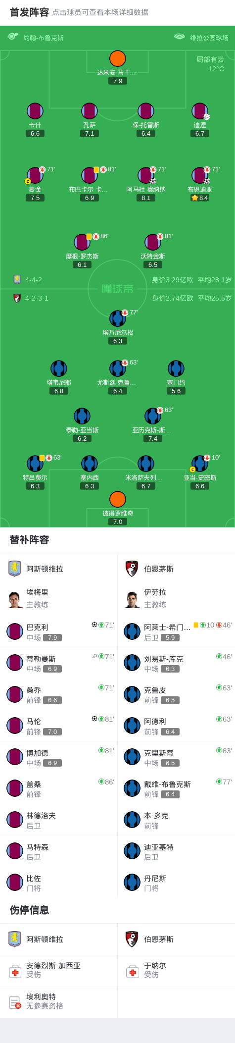 维拉40伯恩茅斯,大马丁扑点,布恩迪亚、奥纳纳、马伦破门