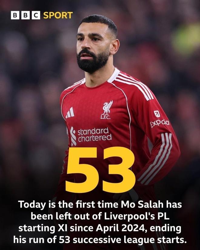 遭遇三连败之后,斯洛特终于弃用了萨拉赫,这是斯洛特执教以来,萨拉赫首次没有在英超首发出场。这也是萨拉赫自2024年4月对西汉姆以来首次在英超担任替补,当时萨拉赫在替补出场时与克洛泽发生争执。回到替补席,让萨拉赫连续53场英超首发的纪录被终结。