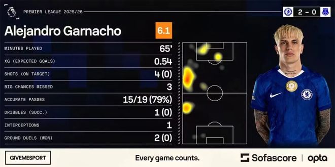 对阵埃弗顿的68分钟里,加纳乔“兑现”了质疑:数据层面,21岁的他错失3次重大机会(本赛季英超第4位单场做到这一点的球员),4脚射门无一射正;对抗0胜出,32次触球里仅6次在埃弗顿禁区。