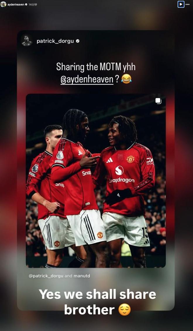 英超第18轮,曼联主场1-0击败纽卡斯尔联,此役表现出色的曼联后卫艾登-海文被现场评为全场最佳球员,并在社交媒体晒出了奖杯,多古在社交媒体询问是否可以分享全场最佳,海文回复道:“