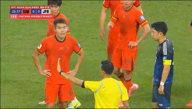 11月19日报道 国足vs日本第26分钟,主裁判突然长时间暂停比赛,字幕显示在检查点球!
