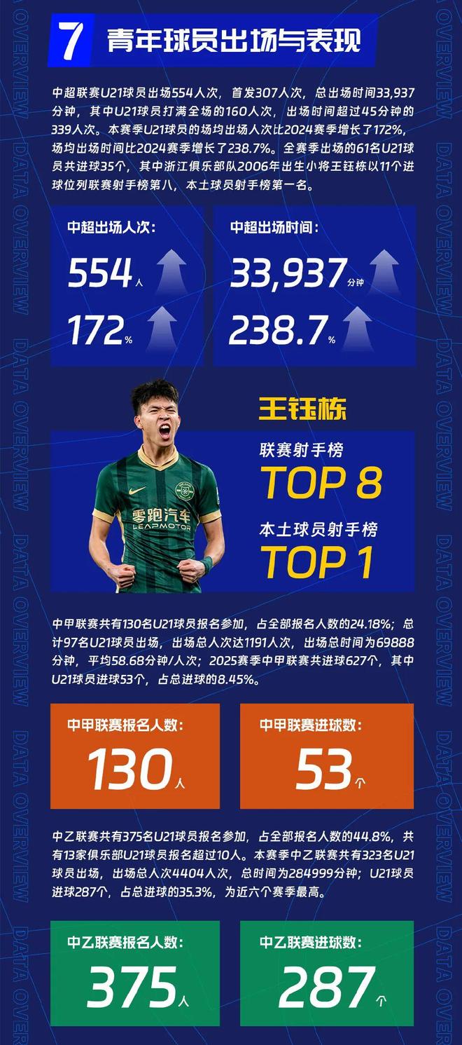 中甲97名U21球员出场,出场总时间为69888分钟,U21球员进球53个;中乙共323名U21球员出场,总出场时间为284999分钟,U21球员进球287个,占总进球的35.3%,为近六个赛季最高。