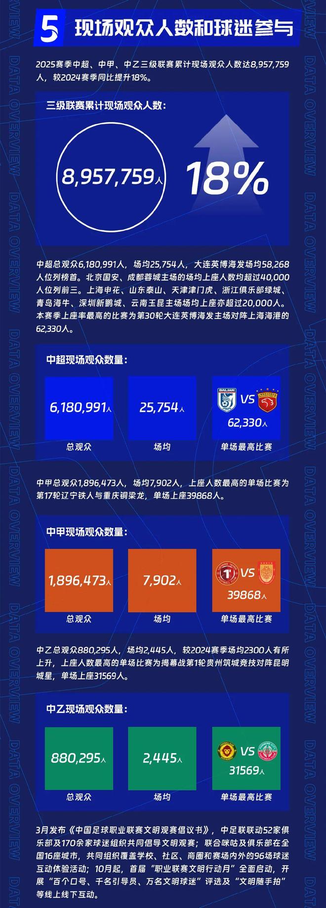 2025赛季中超、中甲、中乙三级联赛累计现场观众人数达8,957,759人次,较2024赛季同比提升18%。