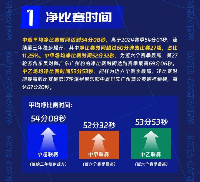 竞赛层面,中超平均净比赛时间达到54分08秒,高于2024赛季54分01秒,连续第三年稳步提升;中甲场均净比赛时间52分32秒,为近六个赛季最高;中乙场均净比赛时间53分53秒,同样为近六个赛季最高。